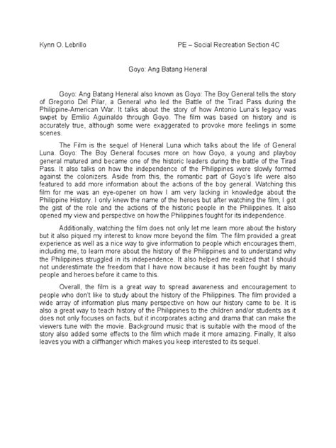 3. Sa huli, ang Goyo ang Batang Heneral ay isang makabuluhang pelikula na nagpapakita ng mga aral at pagpapahalaga tungkol sa ating kasaysayan at kultura. Ito ay dapat panoorin at pagnilayan ng bawat Pilipino upang maunawaan natin ang ating pagkakakilanlan bilang isang bansa at mamamayan.