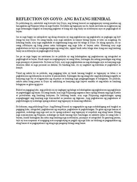 Mga Matatapang na Tagpo - Isang mahalagang bahagi ng Goyo Reflection ay ang pagtukoy at pagsuri sa mga matatapang na tagpo sa pelikula. Ito ay naglalayong bigyan ng pansin ang mga eksena na nagpapakita ng katapangan, pagsasakripisyo, at dedikasyon ng mga tauhan.